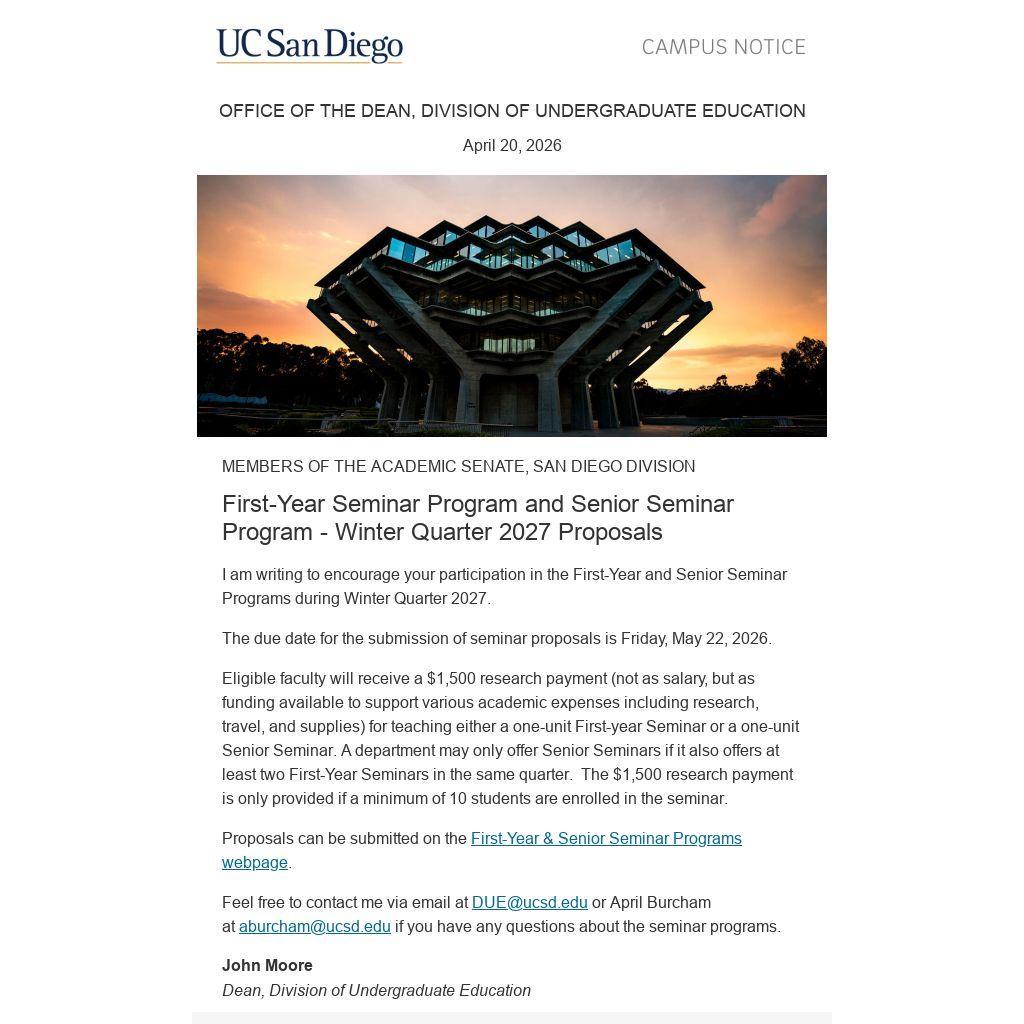 Feel free to contact me via email at DUE@ucsd.edu or April Burcham at aburcham@ucsd.edu if you have any questions about the seminar programs.