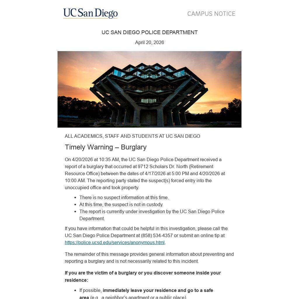 On 4/20/2026 at 10:35 AM, the UC San Diego Police Department received a report of a burglary that occurred at 9712 Scholars Dr. North (Retirement Resource Office) between the dates of 4/17/2026 at 5:00 PM and 4/20/2026 at 10:00 AM. The reporting party stated the suspect(s) forced entry into the unoccupied office and took property.