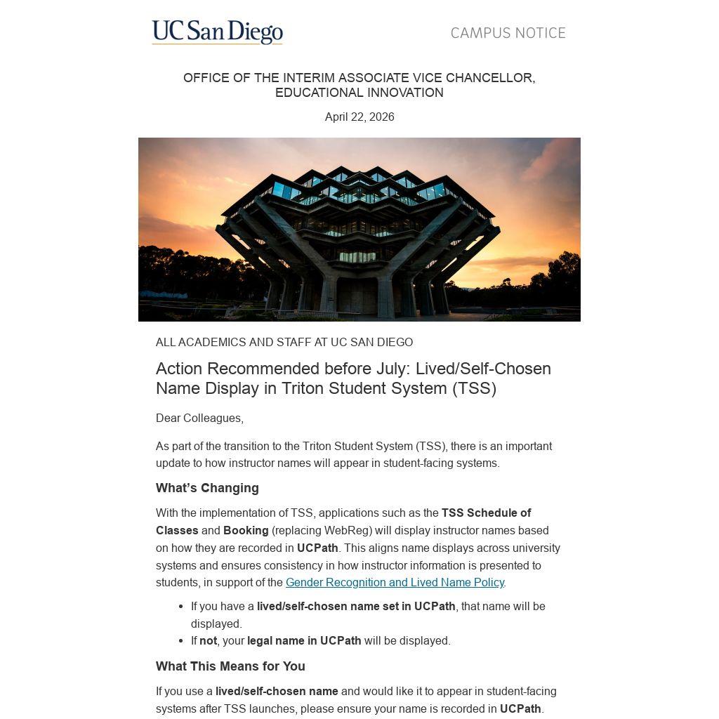 As part of the transition to the Triton Student System (TSS), there is an important update to how instructor names will appear in student-facing systems.