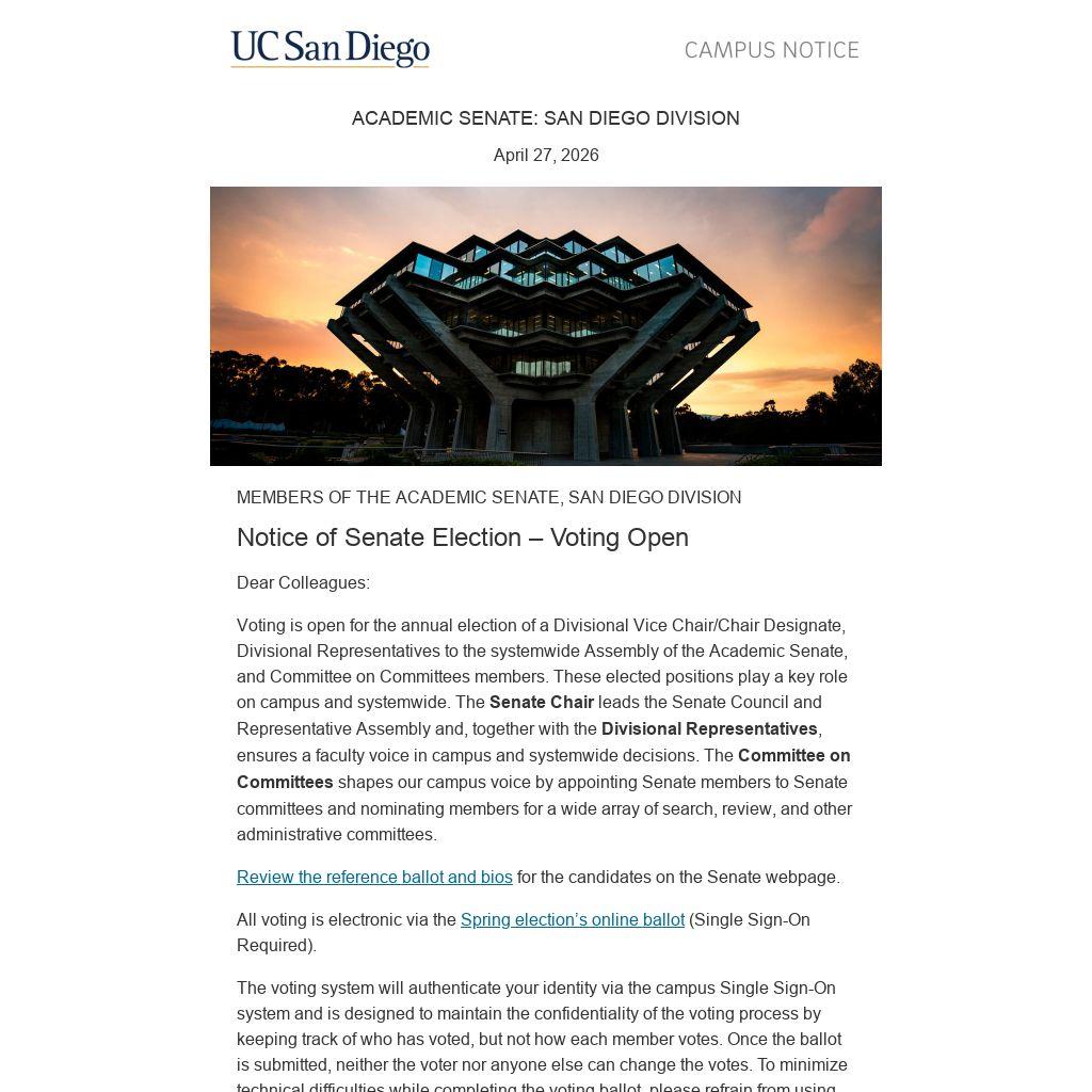 Voting is open for the annual election of a Divisional Vice Chair/Chair Designate, Divisional Representatives to the systemwide Assembly of the Academic Senate, and Committee on Committees members. These elected positions play a key role on campus and systemwide. The Senate Chair leads the Senate Council and Representative Assembly and, together with the Divisional Representatives, ensures a faculty voice in campus and systemwide decisions. The Committee on Committees shapes our campus voice by appointing Senate members to Senate committees and nominating members for a wide array of search, review, and other administrative committees.