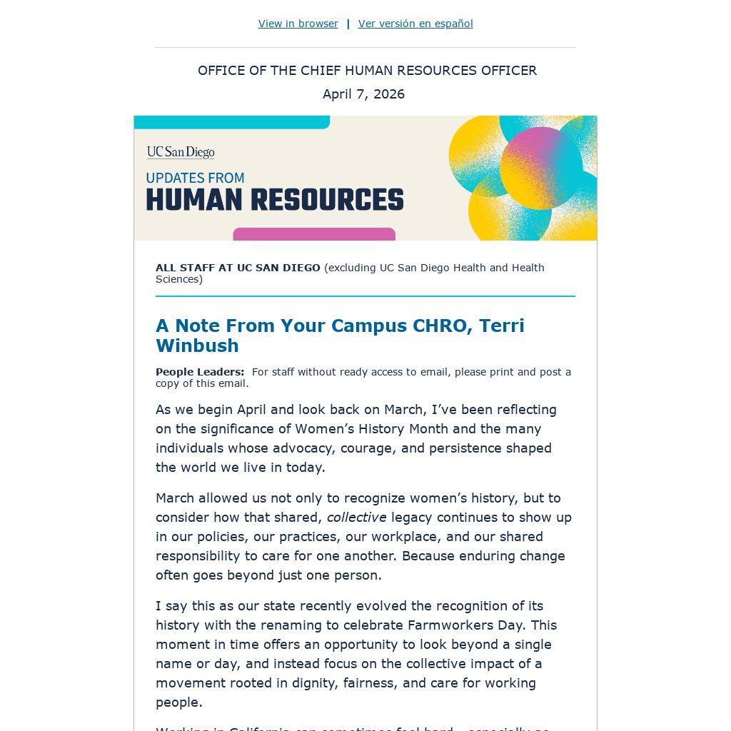 Mark your calendars for Tuesday, May 12 from 1:30 – 3 p.m. for our upcoming Staff Town Hall, focusing on staff performance appraisal, as well as critical and relevant topics that matter the most to UC San Diego staff. Can’t make it the day of the event? A recording will be available on Blink a few days following the meeting. Register in advance and ask questions through Zoom.