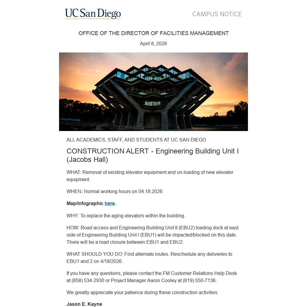 HOW: Road access and Engineering Building Unit II (EBU2) loading dock at east side of Engineering Building Unit I (EBU1) will be impacted/blocked on this date. There will be a road closure between EBU1 and EBU2.